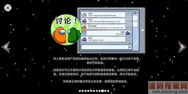 4、有人报告发现尸体或召集紧急会议时,船员们将聚在一起讨论关于伪装者的已知信息。伪装者必须试着证明自己的无辜,或是指控其他船员。